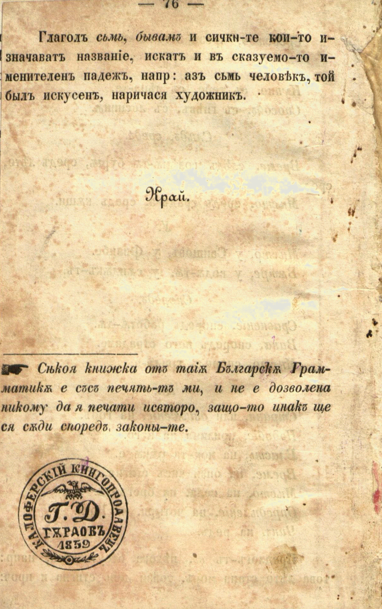 На последната страница: "Сякоя книга от тази Българска граматика е с печата ми, и не е дозволена никому да я печати исвторо, защото инак ще се съди според законите". Печаъ: "Г. Д. Гърдов. 1858 Калоферский Книгопродавец"