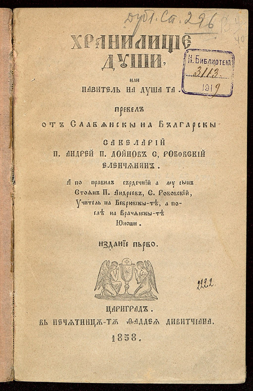 превел от славянски на български сакеларий п. Андрей п. Дойнов С. Робовский еленченин; а поправил сърдечния му син Стоян П. Андреев С. Робовский, учител на бебрювските, а после на враченските юноши